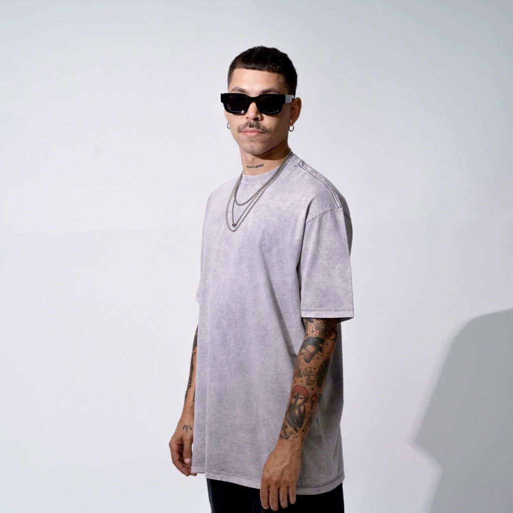 Camiseta modelagem oversized, malha pré encolhida com beneficiamento de lavanderia industrial, acabamento perfeito.